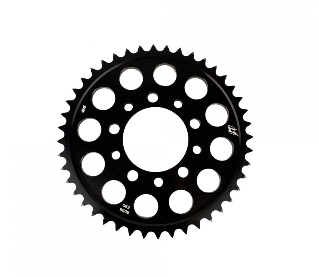 Each sprocket is machined from 7075-T6 alloy these sprockets are ultra light using lightening holes as well as lowered front surface to achieve one of the strongest and lightest sprockets on the market today. They're then stage 2 anodized in either black, blue, gold, or red. Available in 520, 525 and 530 pitch with a range from 36-54 teeth on most applications.