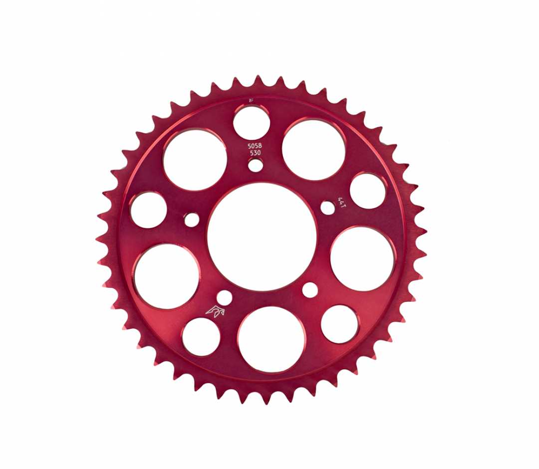 Each sprocket is machined from 7075-T6 alloy these sprockets are ultra light using lightening holes as well as lowered front surface to achieve one of the strongest and lightest sprockets on the market today. They're then stage 2 anodized in either black, blue, gold, or red. Available in 520, 525 and 530 pitch with a range from 36-54 teeth on most applications.